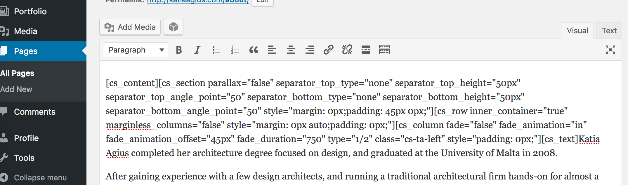 When the user logs in, to edit text, the Page editor (in the Visual tab) is showing a bunch of code mixed with the text.