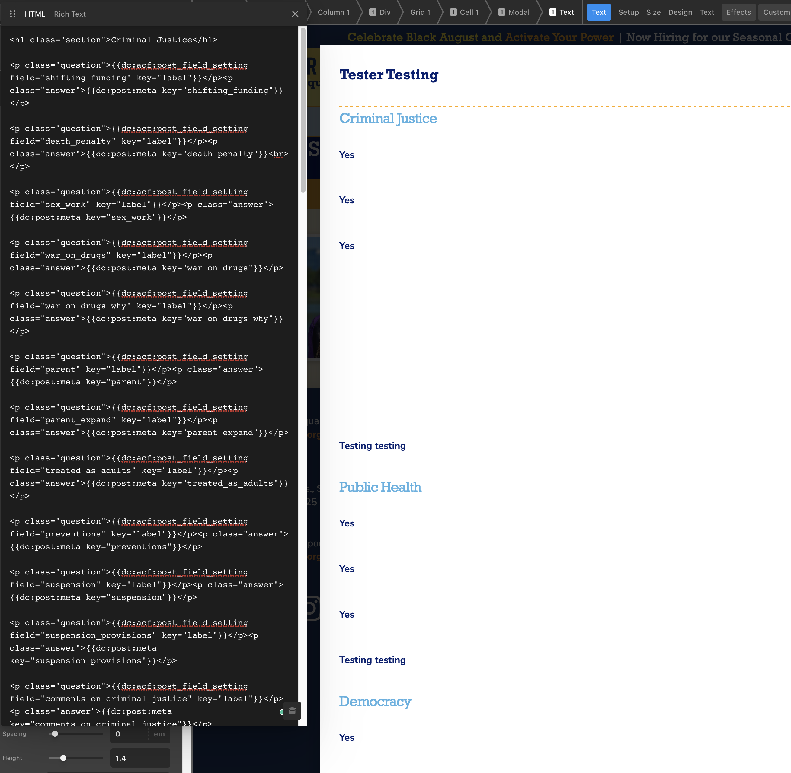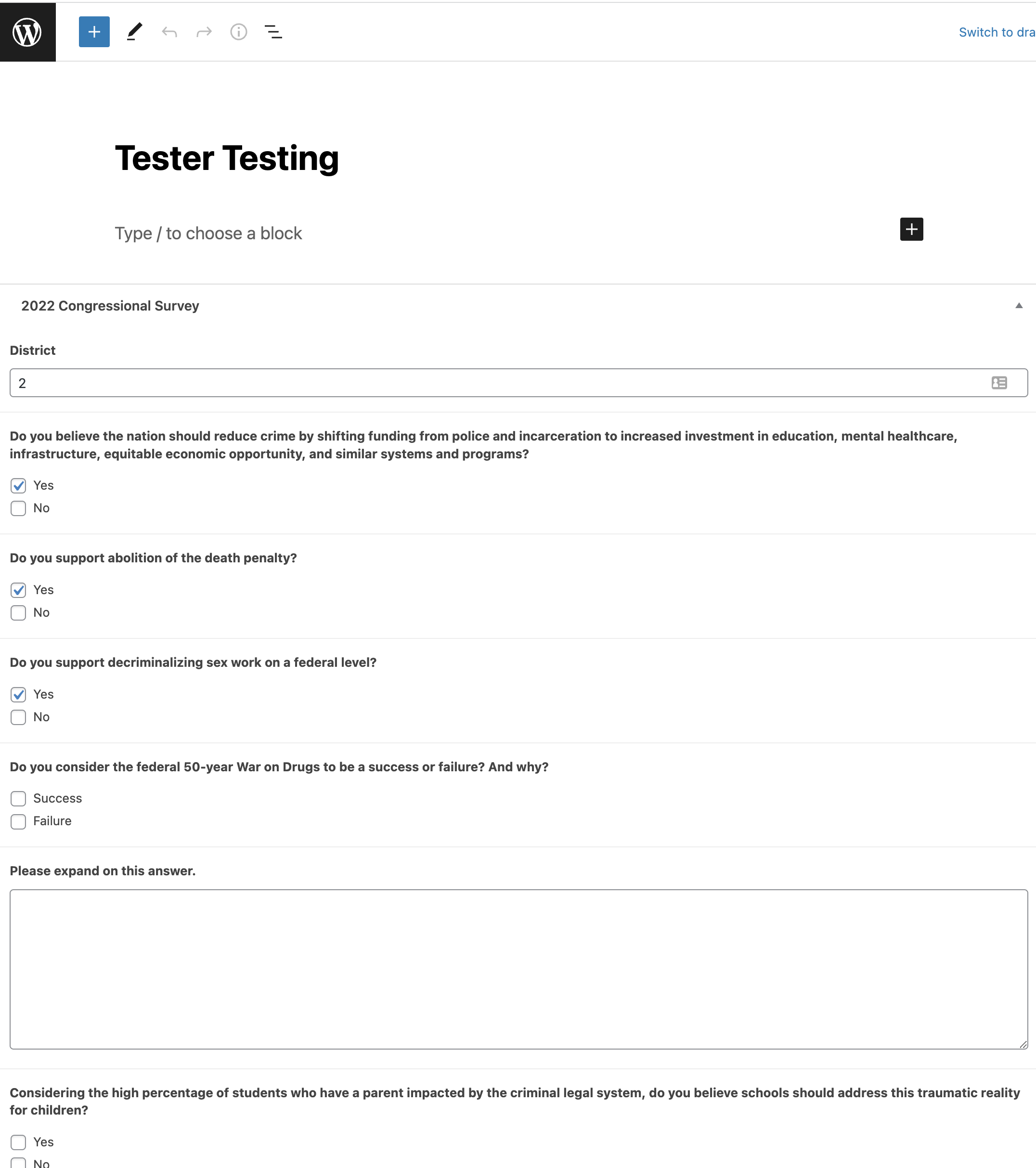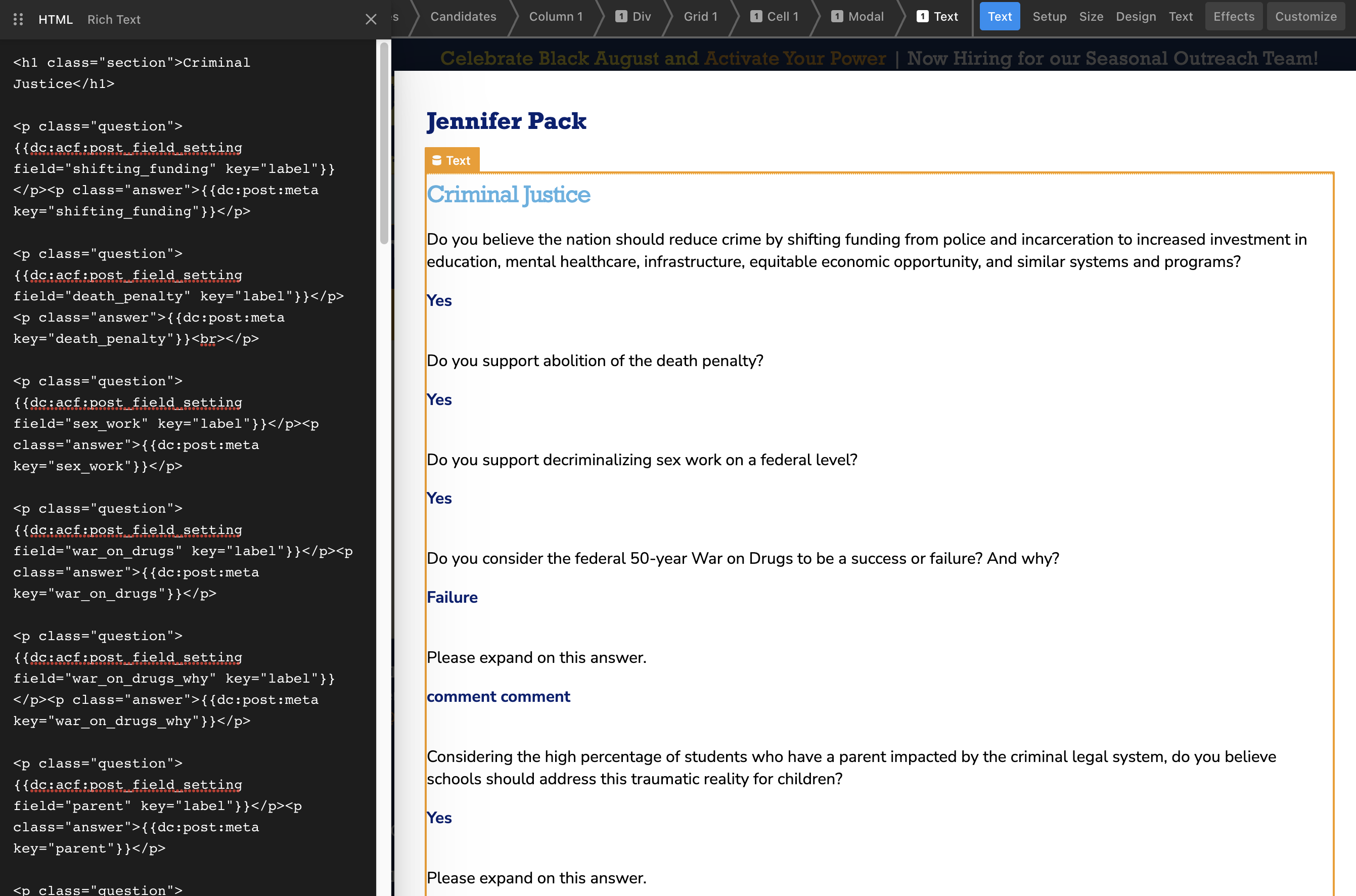 I am setting up a candidate survey. I’m using Formidable Forms that will create a post and have connected the fields to ACF fields within the new post. Then I’m pulling in from the post dynamically into a modal text block.