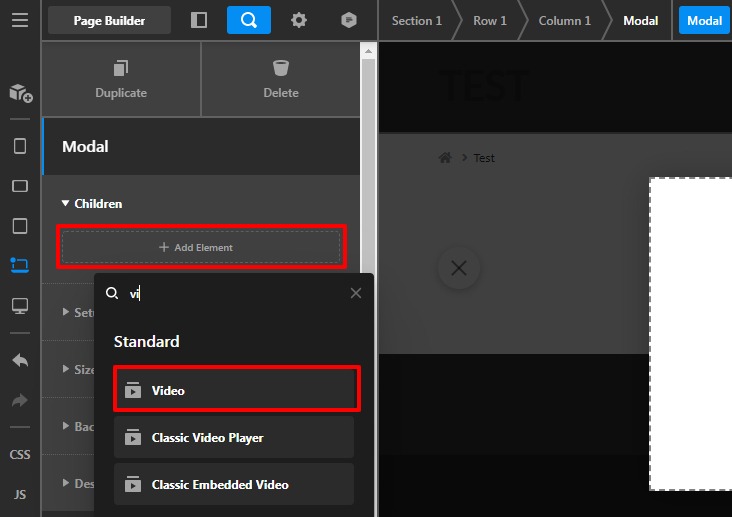 To get a video popup you need to use the Modal element then inside the Modal element you can use the video element.
