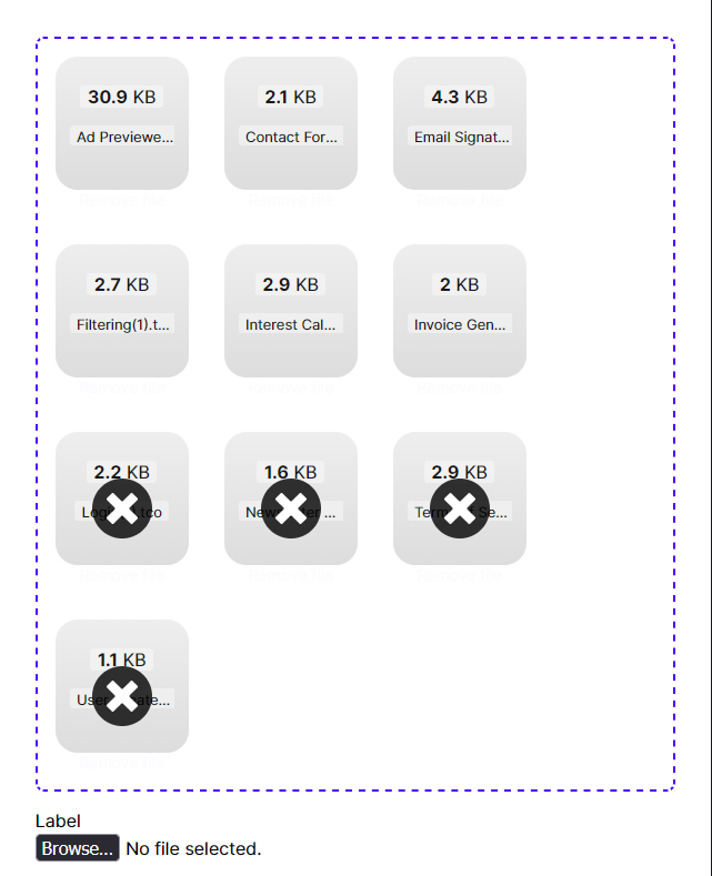 There are no controls to change any of the styling of the file preview grid inside the Dropzone. As you can see the spacing is off and the overlayed delete buttons are quite large. Would it be doable to add desing controls for all of this?