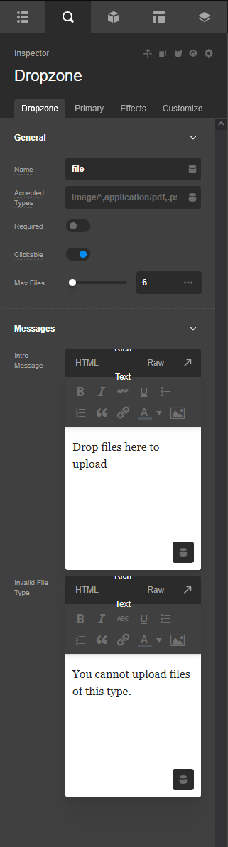 The Dropzone message inputs visually break when the Inspector panel is at its narrowest.