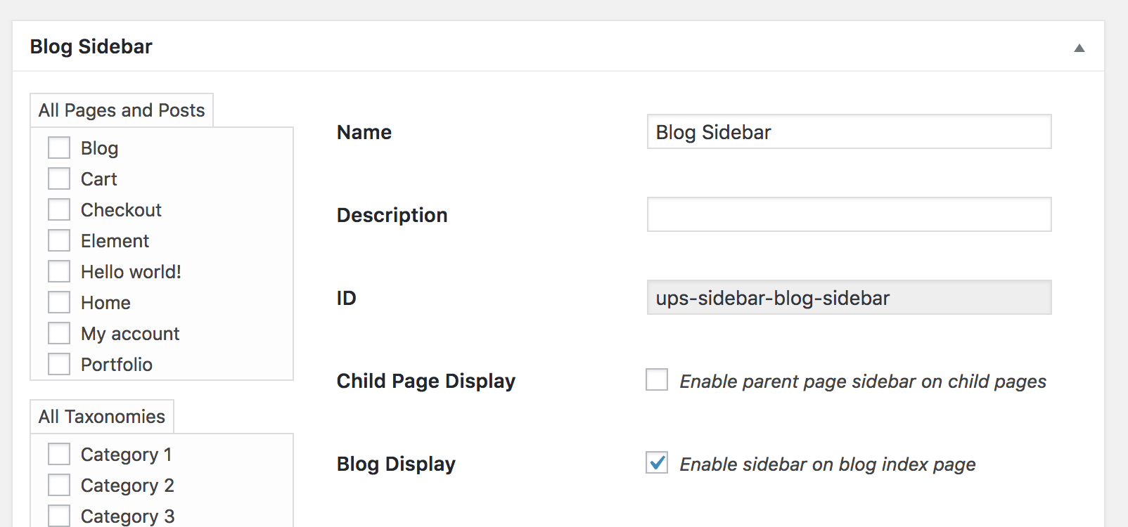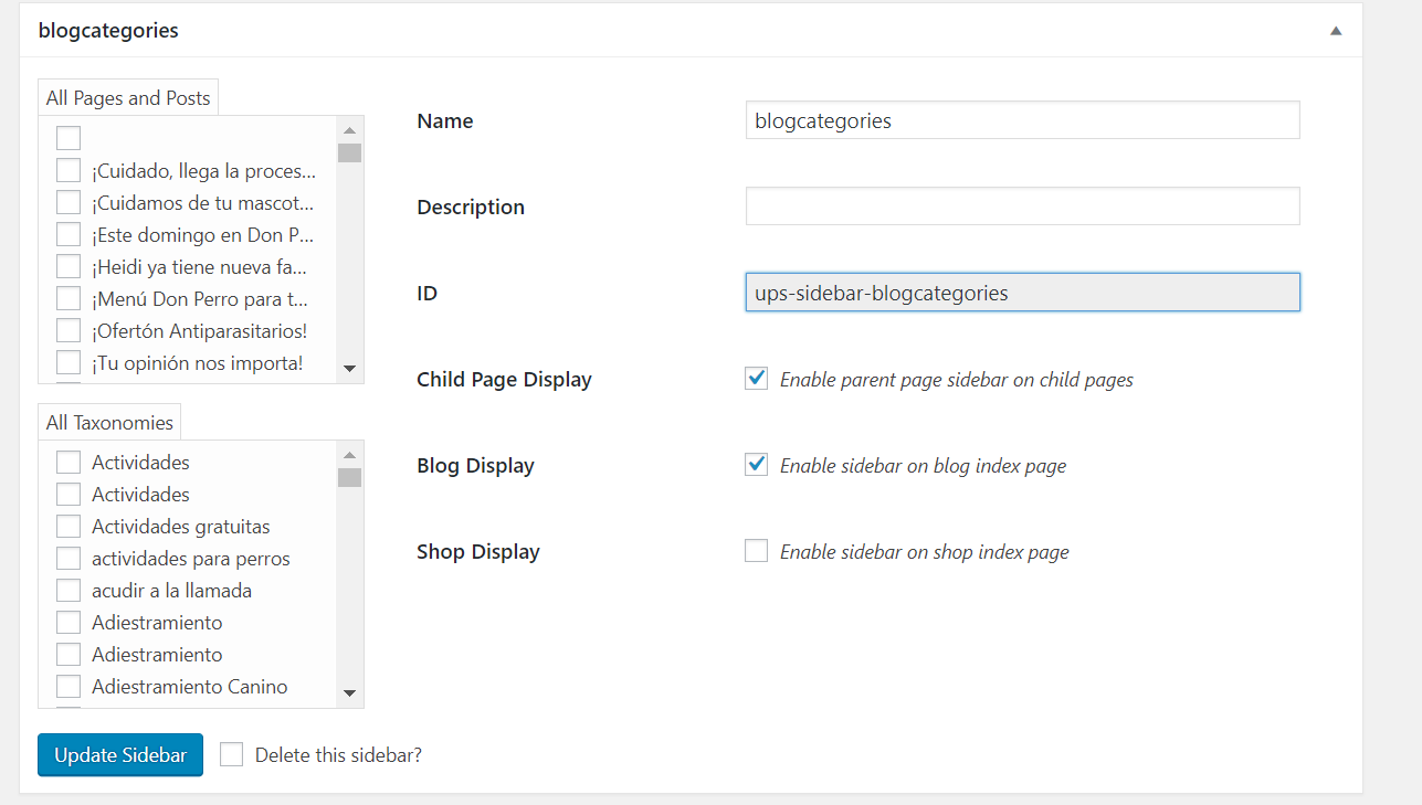 The ups-sidebar-blog-sidebar should be the ID of blog sidebar: