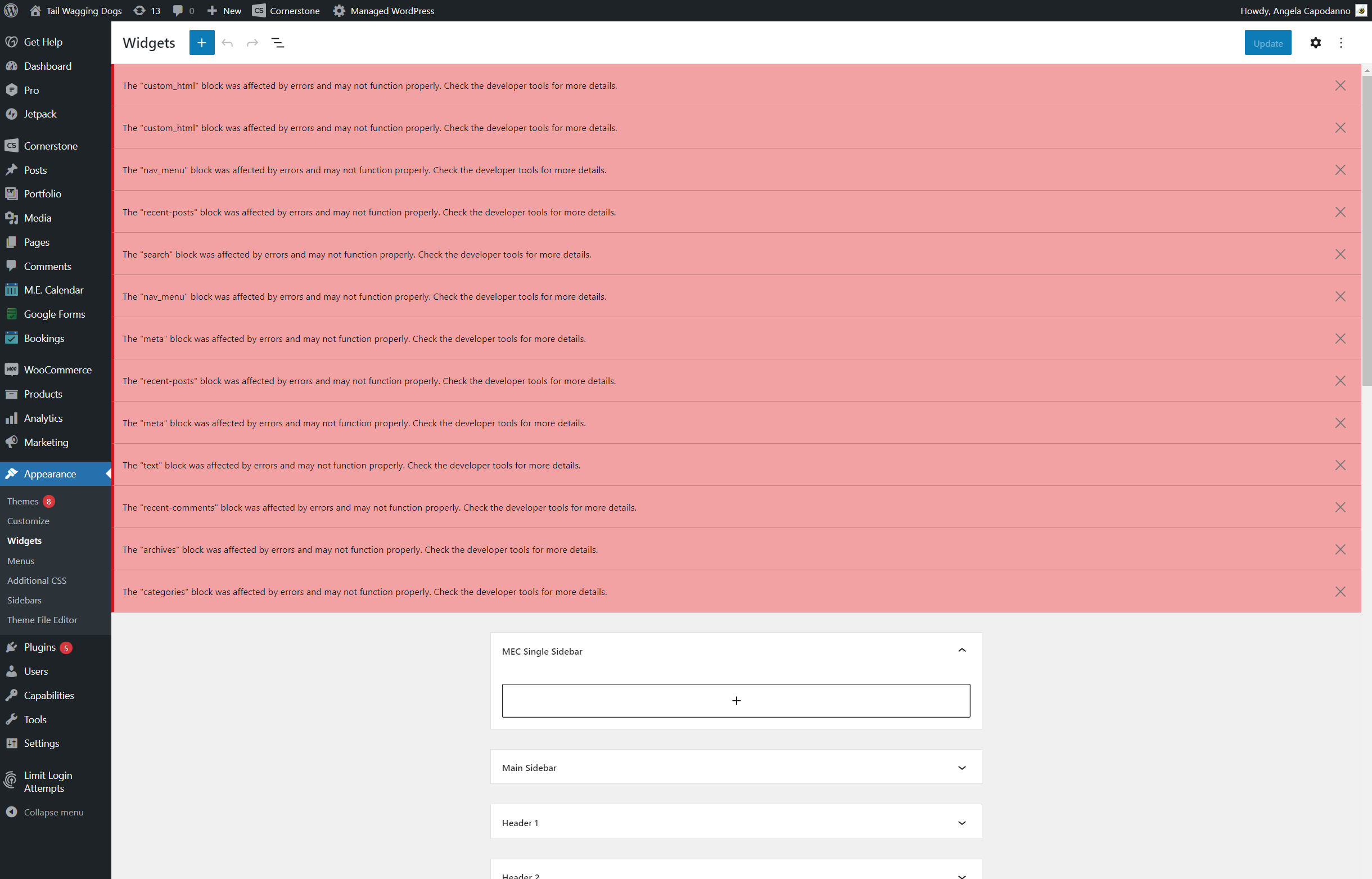 I’m having trouble accessing widgets. Notice my screenshot, showing a bunch of errors. I tried turning off all plugins, and these errors still existed.