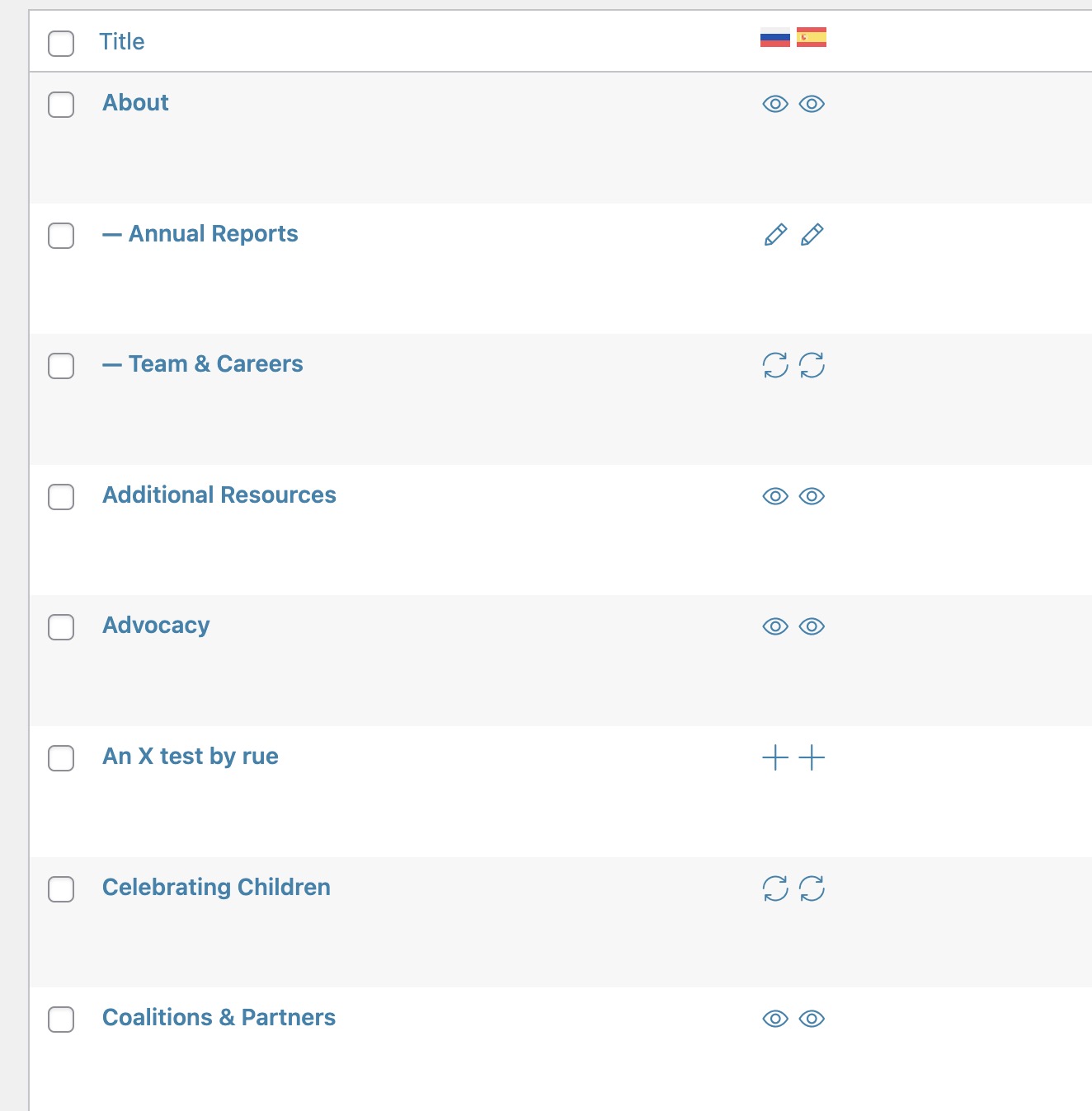 If you check out the “An X Test by Rue” page, you will notice that it has the (+ icon) which means that there are no language translations for that page yet. So, if you are in the builder, as soon as you click on the flag in the upper right corner, it will ask you to create one as shown in the screenshot above.