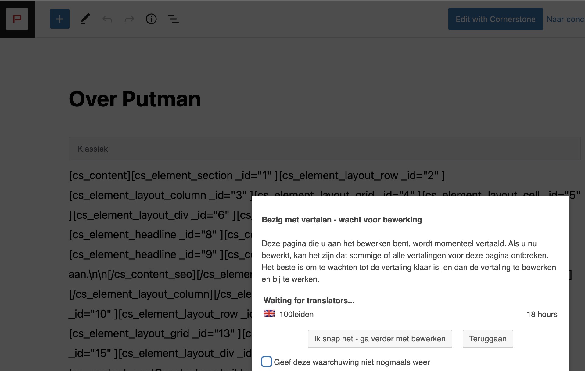 I can’t make use of the duplication method with the language flags in cornerstone because first of all that’s not maintainable whenever the original language page changes. Second of all we are making use of a translation service through the wpml translation management. So I absolutely need to make use of the translation management.