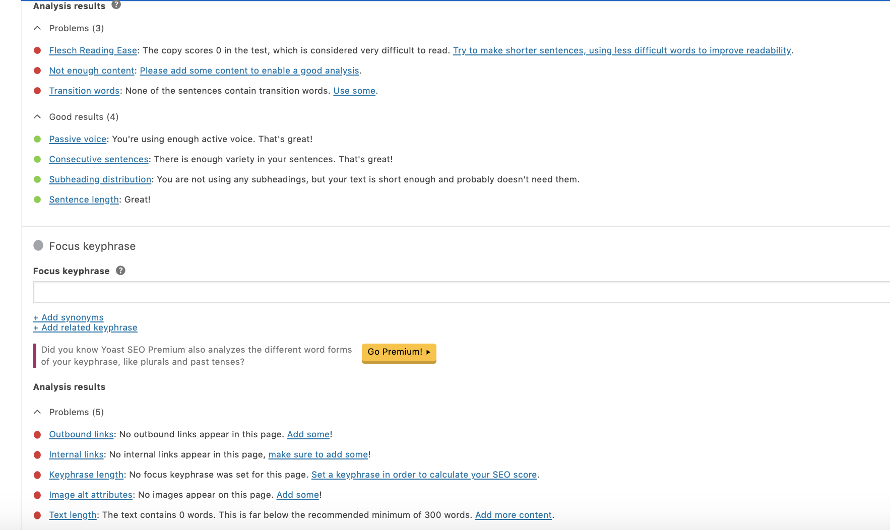 I recently just installed Yoast SEO. When I ‘edit’ one of my pages to identify the Yoast info of the page, nothing comes up, as shown here: